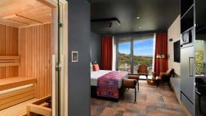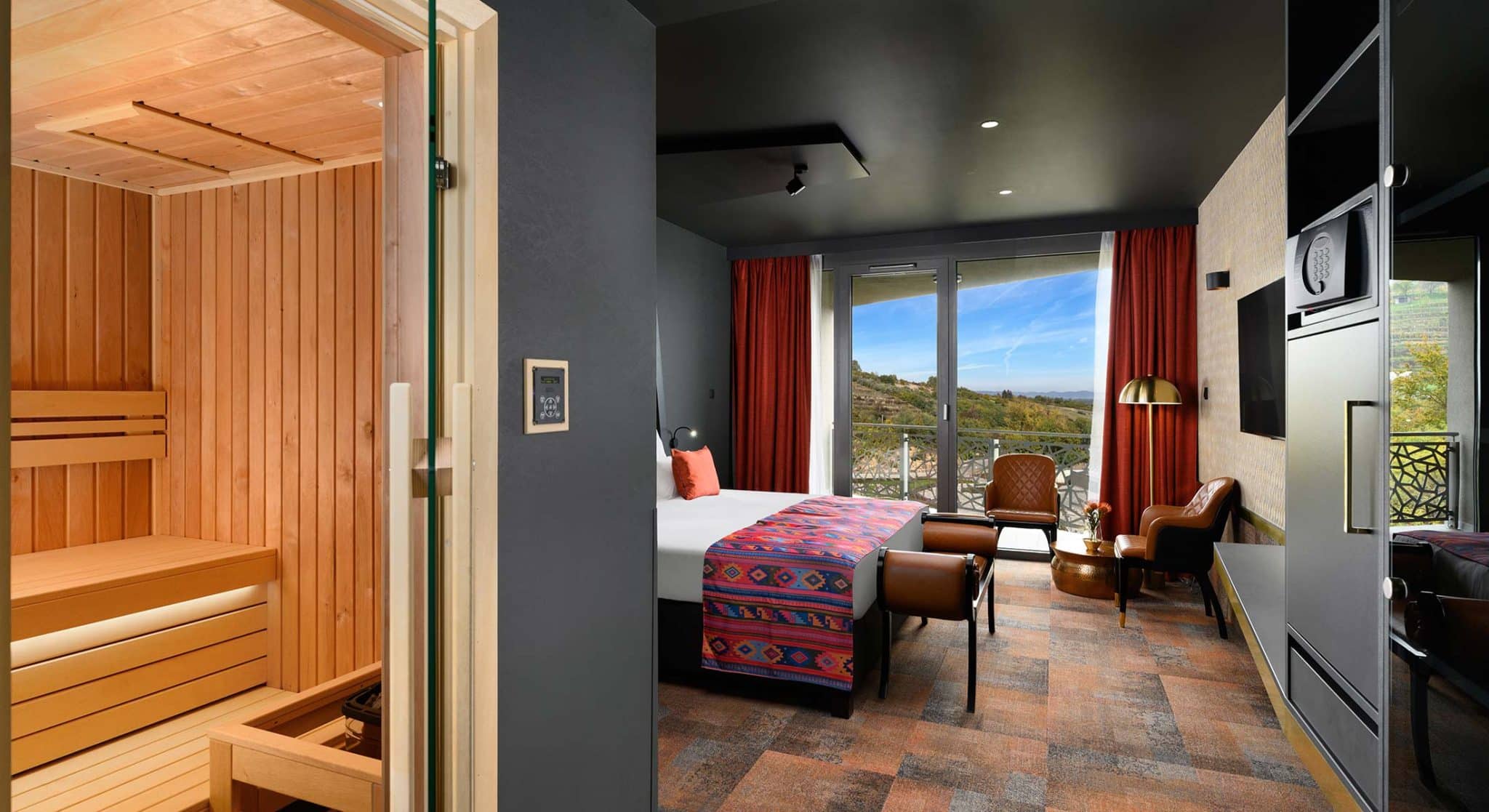 Les chambres et suites allient matériaux locaux (pierre, bois et design épuré), lumière naturelle, panorama sur les vignobles, terrasses privées ou balcons donnant sur les coteaux. Tous les espaces invitent à la rêverie sans ostentation.